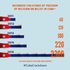 Dear Alberto, In our new report, CSW has found that there was a tenfold increase in the number of violations of religious freedom in Cuba in 2015. 2,300 separate violations were recorded in 2015, compared with 220 in 2014. | ||||